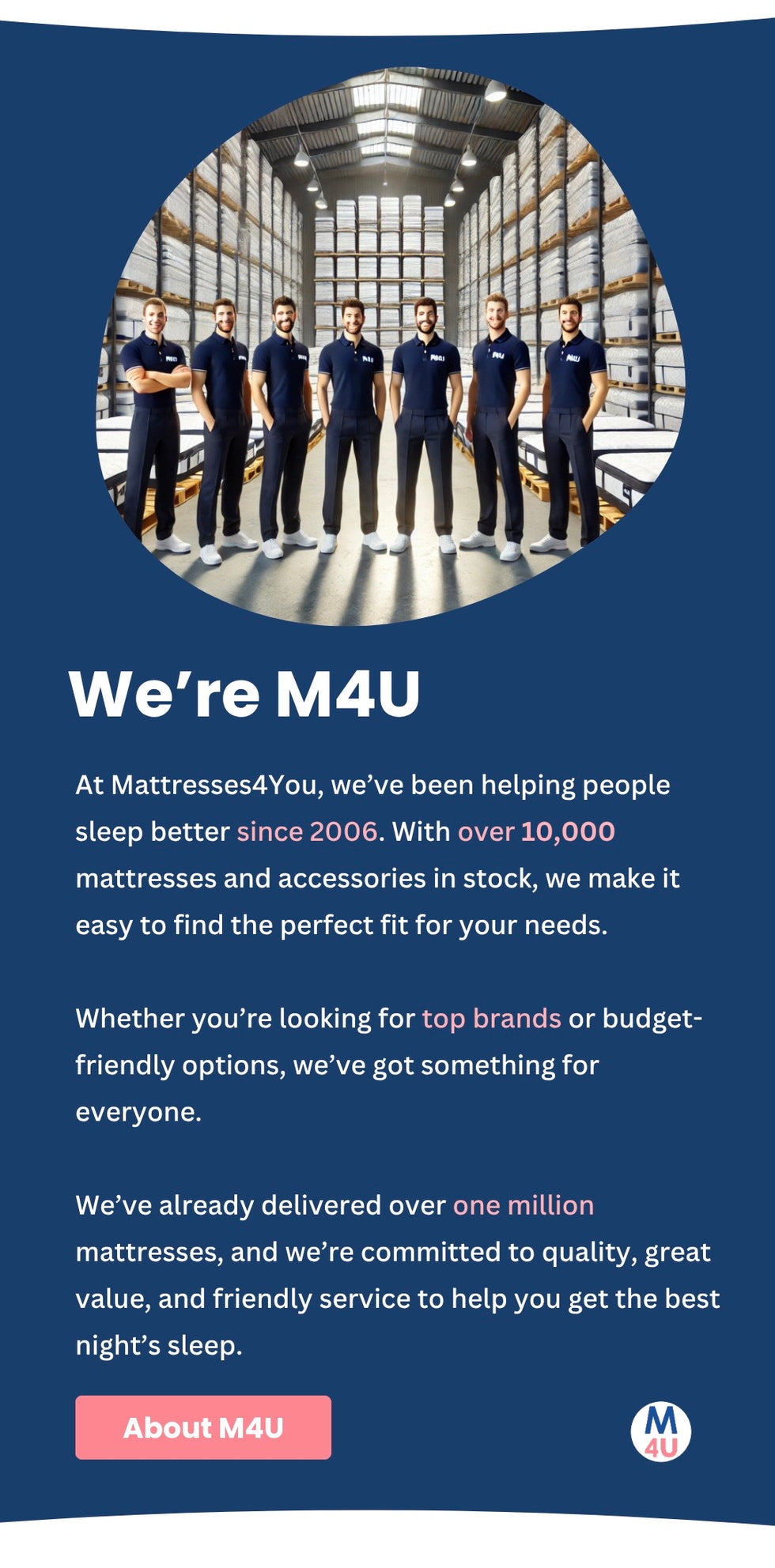 Very happy with our new mattress, Adam kept us informed all the way through the process from order to delivery. The delivery driver was very friendly and helpful. I would definitely use mattresses 4 you again.