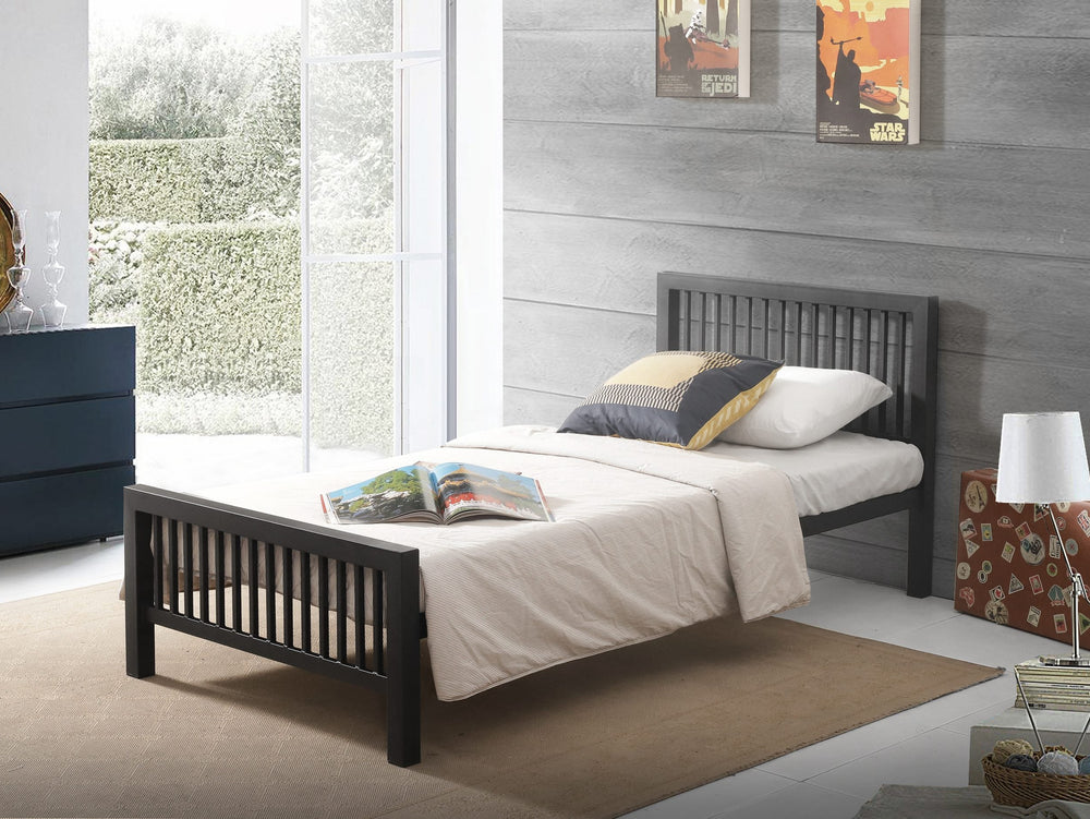Meridian is a modern low head and footboard shaker metal bedstead which is ideal for loft, studio and second bedrooms.  Finished in a matt black it can be easily accessorised with colourful or bland bedding. Now also available in a small double – 4ft.