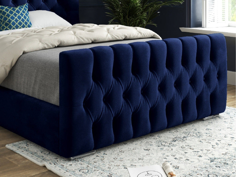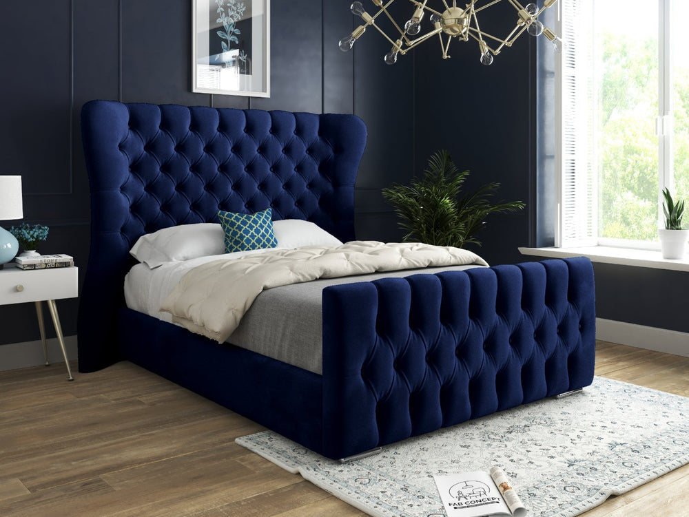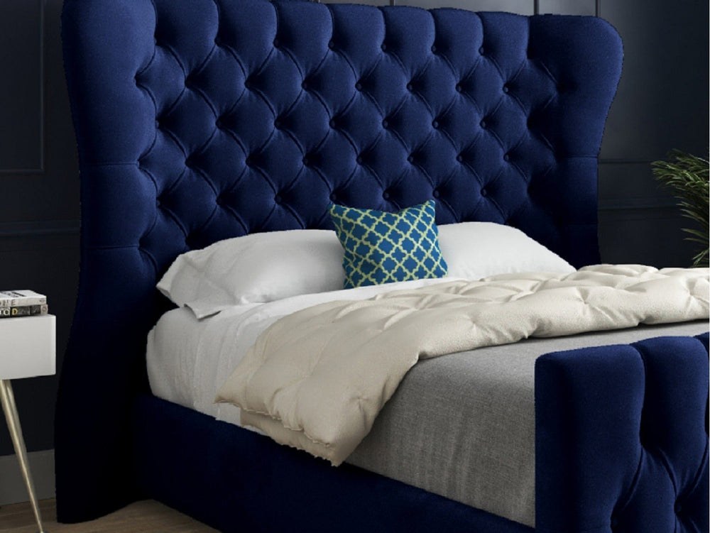 Wingback Wide Curved Upholstered Soft Velvet Fabric Button Bed Frame (Blue)